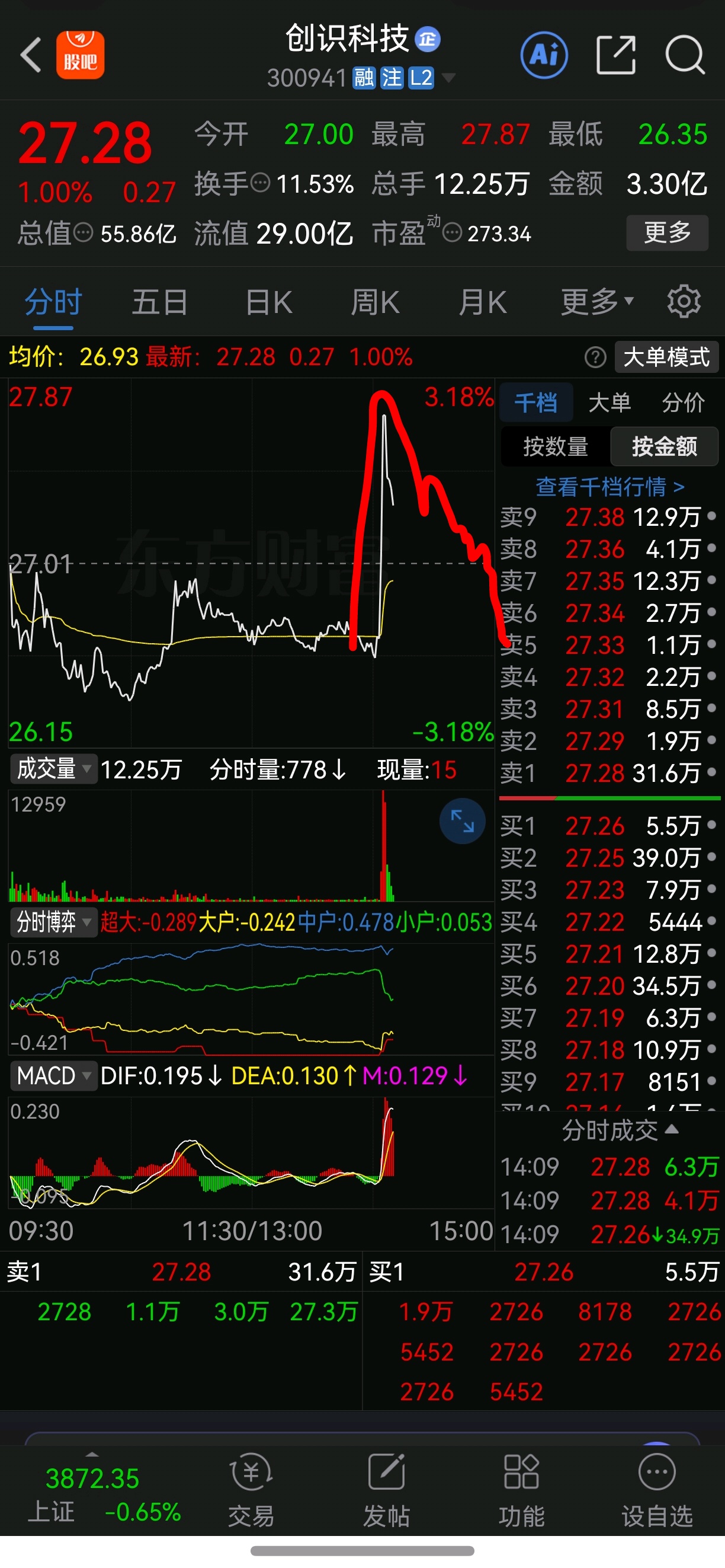 $创识科技(SZ300941)$ 大盘崩的时候,千万避免做这种票,平时无人问津,突然一根直线脉冲起来,特别是大盘走崩的时候,也可能就是一笔试盘单子拉的,没有任何意义,冲高回落是大概率的,第二天低开低走,全部闷在里面,大盘强势的时候就涨不动,怎么可能逆大盘表现呢,都是套路