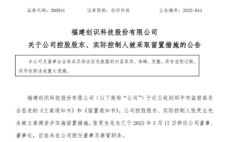 创识科技公告称,张更生已于2025年5月17日辞任公司董事、董事长,目前未在公司担任董事及高管职务。截至该公告日,公司董事及高级管理人员均正常履职,董事会依法履行相关职责。“目前,公司尚未知悉上述事项的进展及结论。公司将持续关注上述事项的后续进展情况,并按照有关法律、法规的规定和要求,及时履行信息披露义务。”创识科技称。