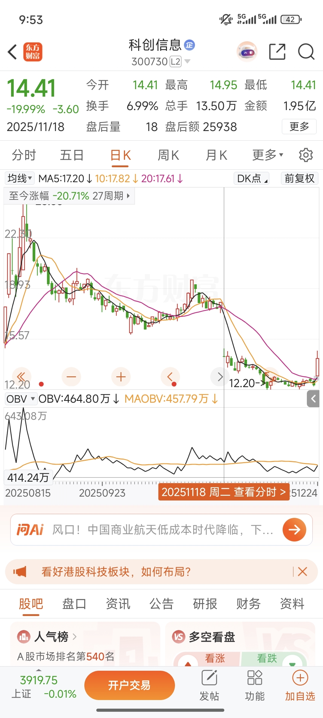 $创识科技(SZ300941)$ 跟科创信息11月18号差不多了,今天平盘,明天再跌