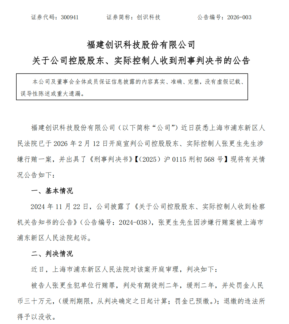 2月13日晚间,创识科技发布公告称,公司控股股东、实际控制人张更生因犯单位行贿罪,被法院一审判处有期徒刑二年,缓刑二年,并处罚金30万元。