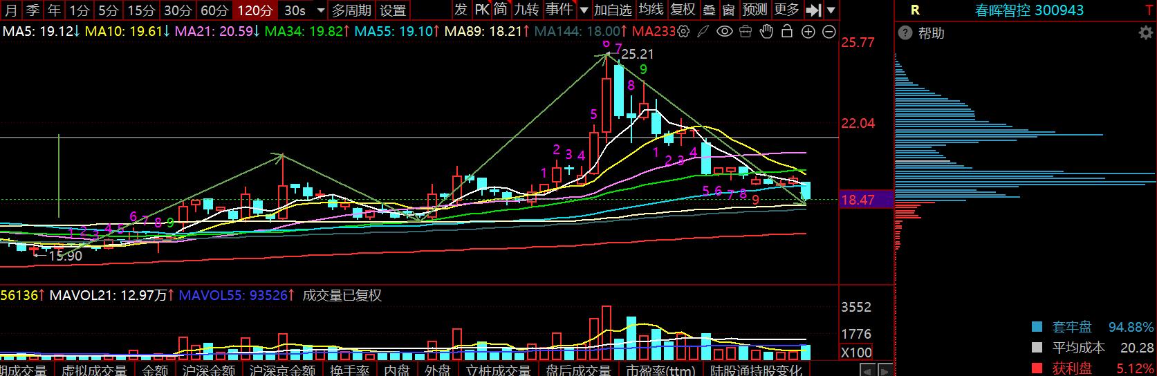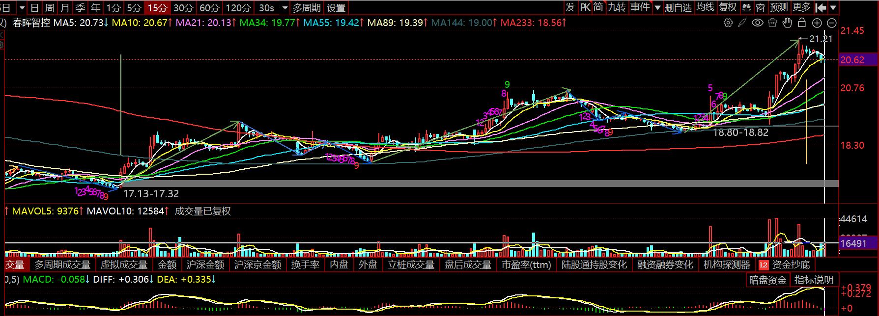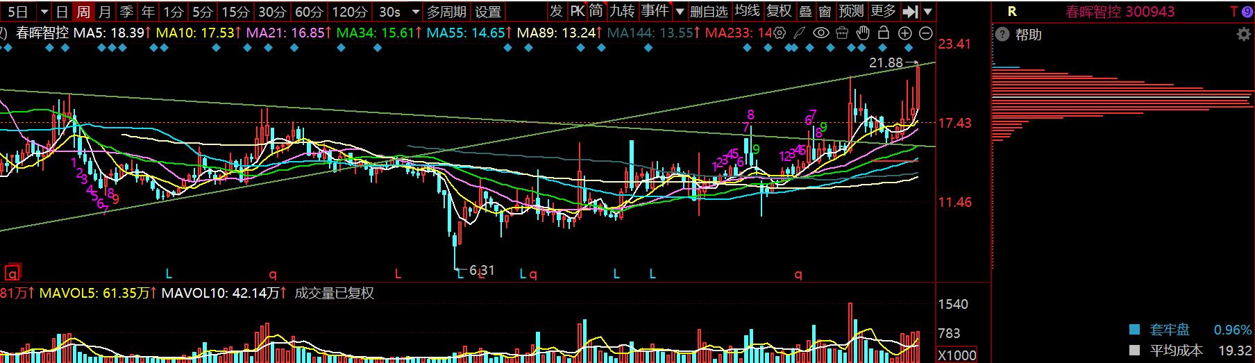 春晖的周线图,21.88是个压力位。连涨3天,明天大概率是冲高回落,看本周周线是否成功突破21.88的压力,并回踩确认,下周就可继续上涨。如果无法突破,下周就要回落蓄势,磨蹭一周再说。