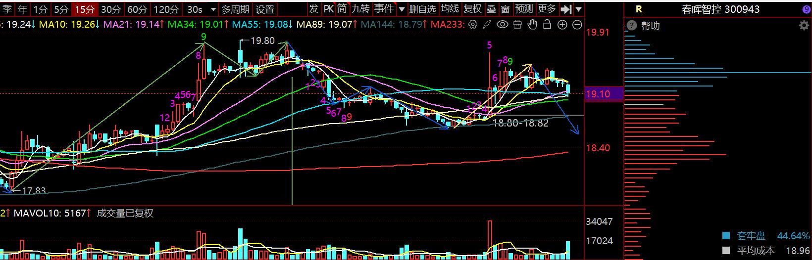 大盘确认3040开始的3浪在4034点结束,4浪调整到今天第6天,跌了200点。春晖每天都在创新低,所以创新低只能观察不能买入。春晖在走334浪,今天c段与a段等长,都是4天。上方套牢盘太重,主力不停的向下杀跌,结果筹码峰上看散户不愿意割肉。最好的办法是反弹上去一些,再来回震荡。创新高25.21之后连续调整了2周,下周看反弹,压力在18.60~19.23那个缺口这个区间。