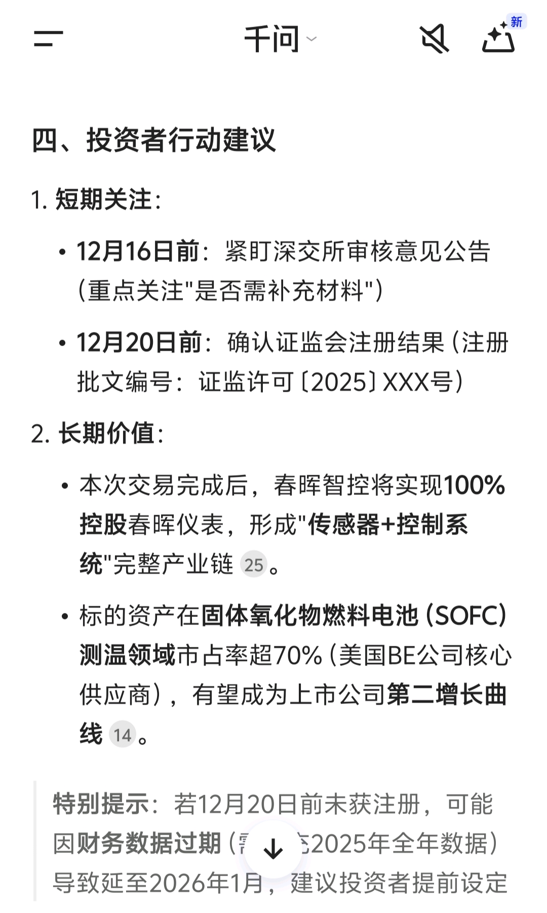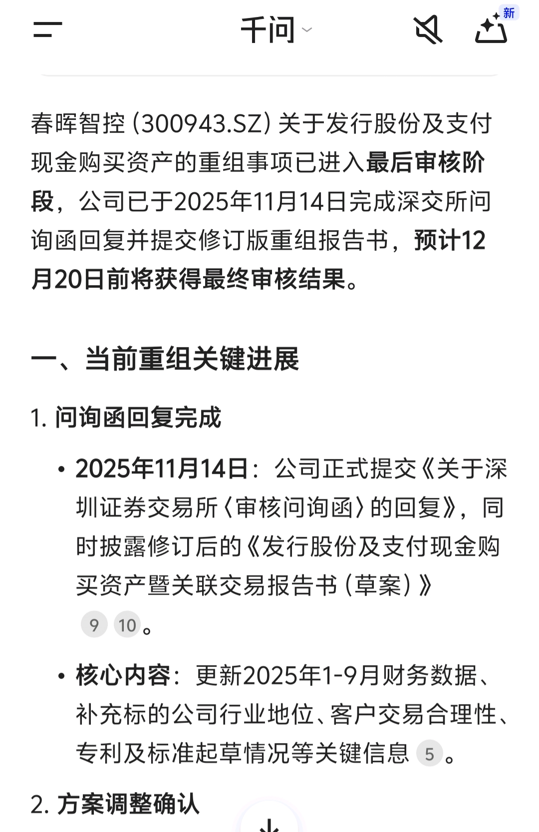 大家好,这是我在我在千问看到的。分享给有缘人。春晖智控最近也是一直横盘等待消息,看来不日就会出结果了。