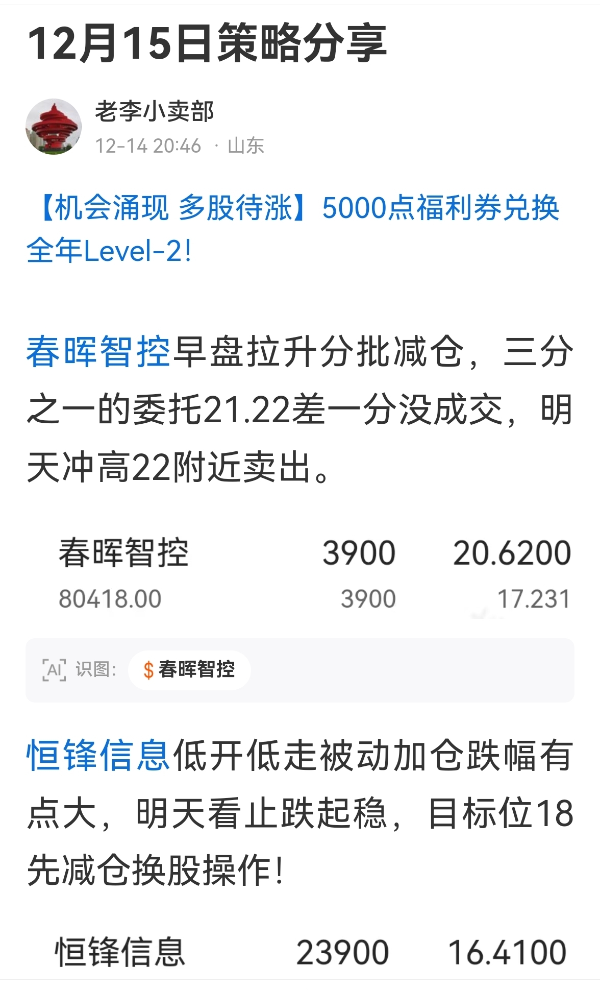 $春晖智控(SZ300943)$ 明天冲高是机会可换股操作,详见15日策略分享及组合变化