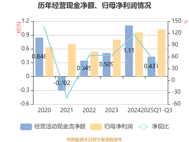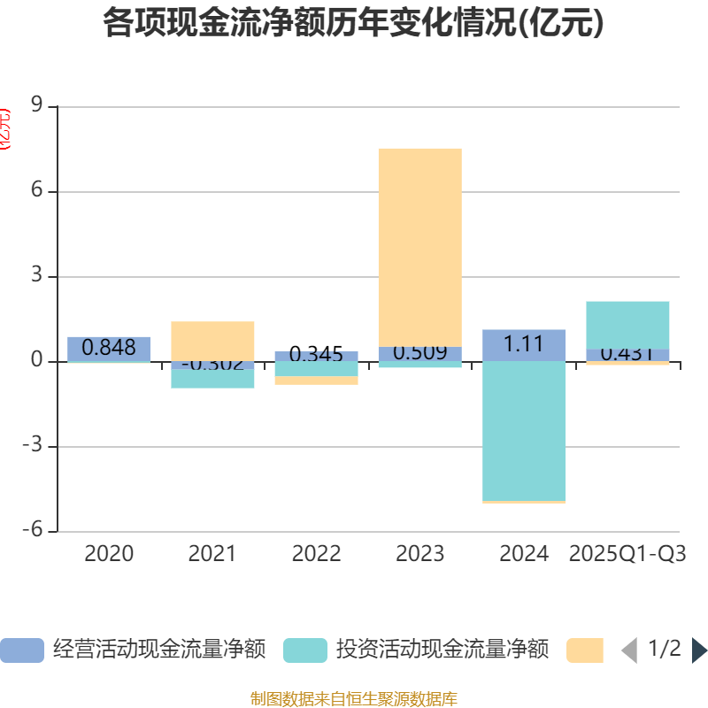 2025年前三季度,公司经营活动现金流净额为4308.07万元,同比下降28.47%;筹资活动现金流净额-1402.27万元,同比减少2629.84万元;投资活动现金流净额1.67亿元,上年同期为-4.64亿元。