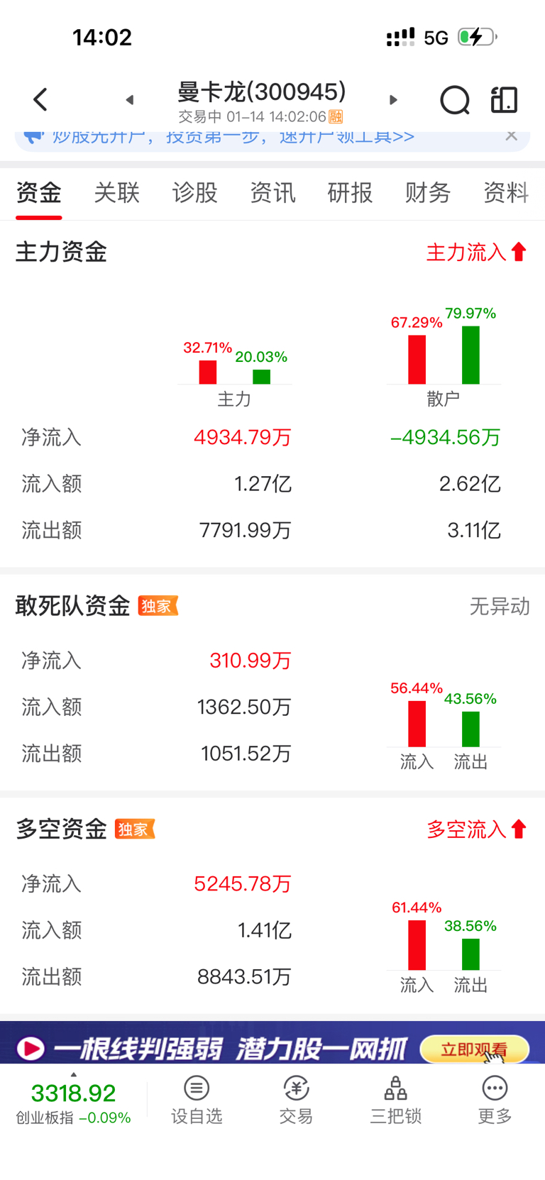 $曼卡龙(SZ300945)$ 主力流入、敢死队流入,多空资金流入,散户流出,所以一直涨。