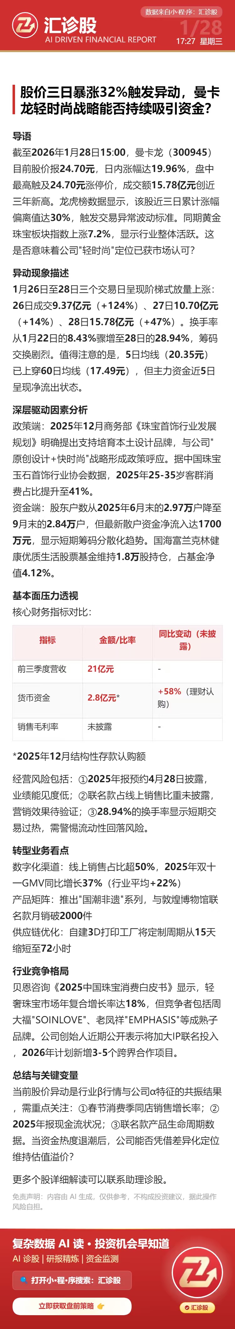 股价三日暴涨32%触发异动,曼卡龙轻时尚战略能否持续吸引资金?