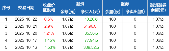 德必集团:融资净偿还10.2万元,融资余额1.07亿元(10-22)