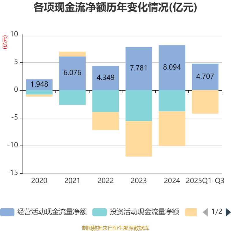 2025年前三季度,公司经营活动现金流净额为4.71亿元,同比下降6.24%;筹资活动现金流净额-4.24亿元,同比减少1179.8万元;投资活动现金流净额606.87万元,上年同期为-2.21亿元。