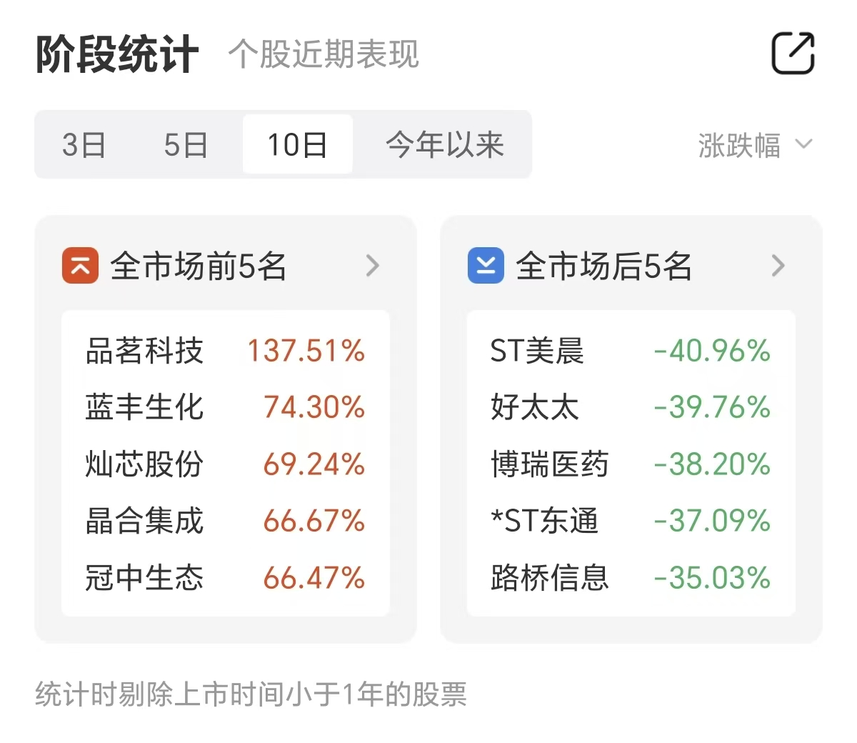 与此同时,近十个交易日涨幅前五名的个股分别为品茗科技、蓝丰生化、灿芯股份、晶合集成、冠中生态。