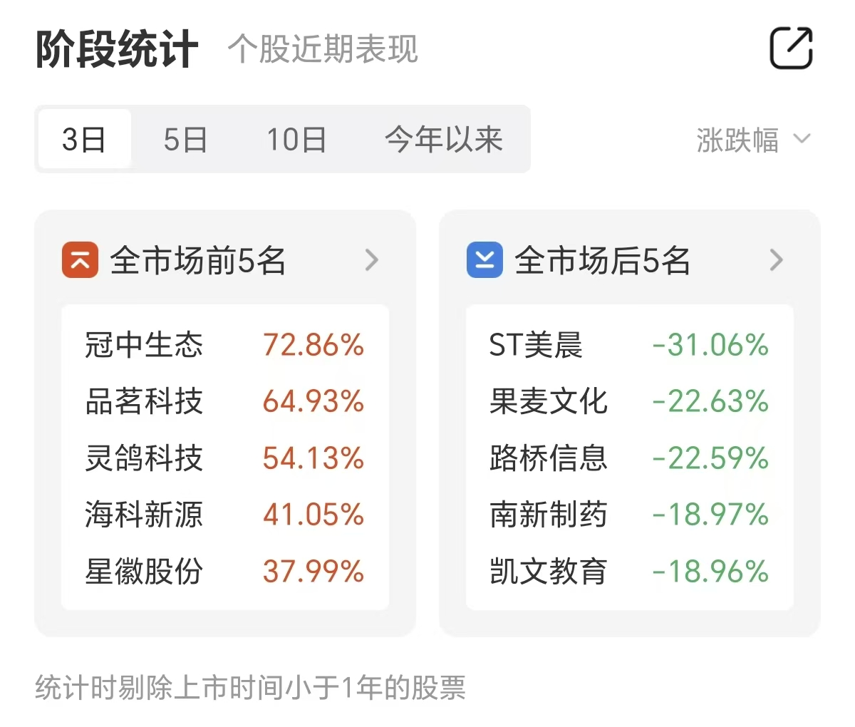 周四市场震荡走高,A股全市场涨幅前五名分别为冠中生态、品茗科技、灵鸽科技、海科新源、星徽股份,其中冠中生态三日涨幅达72.86%,位列涨幅榜第一。