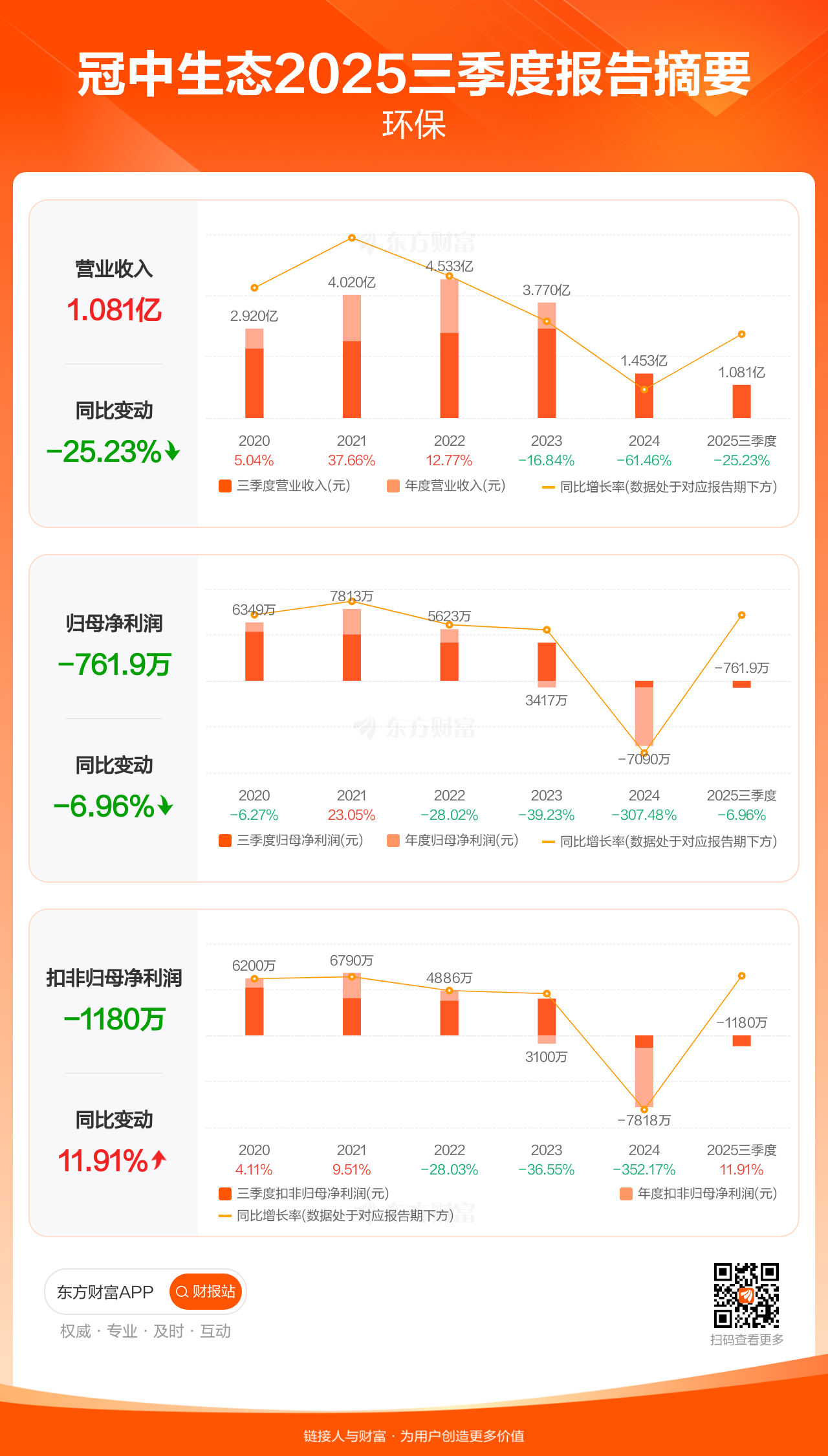 冠中生态10月29日发布2025年三季报显示,公司前三季实现营业收入1.08亿元,同比下滑25.23%;归母净利润-761.87万元;扣非归母净利润-1180.33万元。