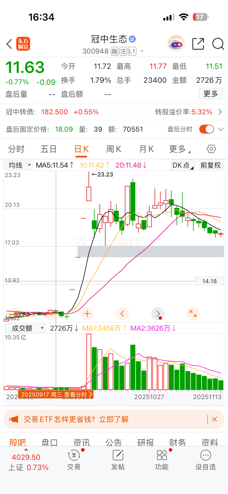 冠中生态这票正常会到这个位置开始反攻,14.2位置应该会开始反攻,庄家明天别低开