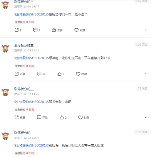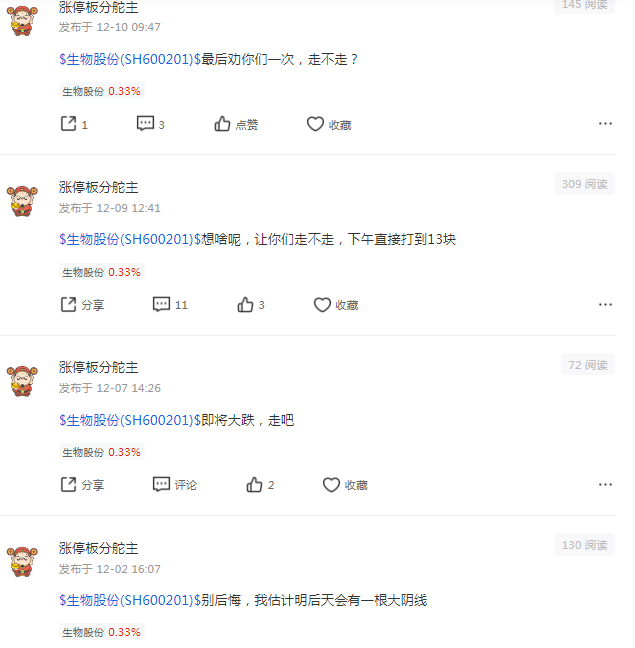 正常人逻辑分析:“涨停板分舵主”这个坏人kong狗zhuang庄xiao丑既然不看好为什么不gun远一点,离开这个票!为啥要浪费时间去关注发帖?!大家注意“涨停板分舵主”这个坏人kong狗zhuang庄xiao丑托好坏!打他的脸来了!到处发帖子配合庄家唱空收购韭菜以求得好处,在大涨吃大肉前把散户骗下车!历史动态几个月以来天天唱空生物股份,但股价却不断创新高!大家看下面的图!因为我影响他配合主力洗盘了,他又来通过打压我来骗散户筹码!今天上午股价和可转债不是涨了四五个点吗?打他脸!后面几天大涨打他脸!我们关注和发帖是因为看好!反之不看好的托死皮赖脸关注和发帖是为了什么不可告人的黑心目的?司马昭之黑心路人皆知!