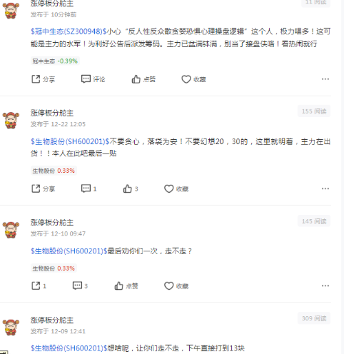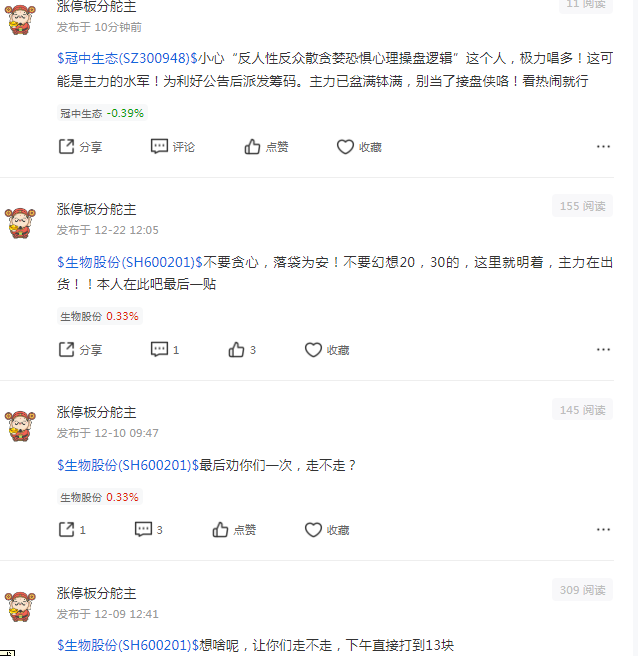 正常人逻辑分析思考一个问题:你看空的票会天天去发帖关注吗?不浪费时间精力吗?吃了饭没事干?那答案出来了!他的言论有黑心钱利可图!“涨停板分舵主”这个坏人kong狗zhuang庄xiao丑既然不看好为什么不gun远一点,离开这个票!为啥要浪费时间去关注发帖?!大家注意“涨停板分舵主”这个坏人kong狗zhuang庄xiao丑托好坏!打他的脸来了!到处发帖子配合庄家唱空收购韭菜以求得好处,在大涨吃大肉前把散户骗下车!历史动态几个月以来天天唱空生物股份,但股价却不断创新高!大家看下面的图!因为我影响他配合主力洗盘了,他又来通过打压我来骗散户筹码!今天上午股价和可转债不是涨了四五个点吗?打他脸!后面几天大涨打他脸!我们关注和发帖是因为看好!反之不看好的托死皮赖脸关注和发帖是为了什么不可告人的黑心目的?司马昭之黑心路人皆知!为了在大涨拉升前配合庄家洗盘骗散户手中的带血的筹码!