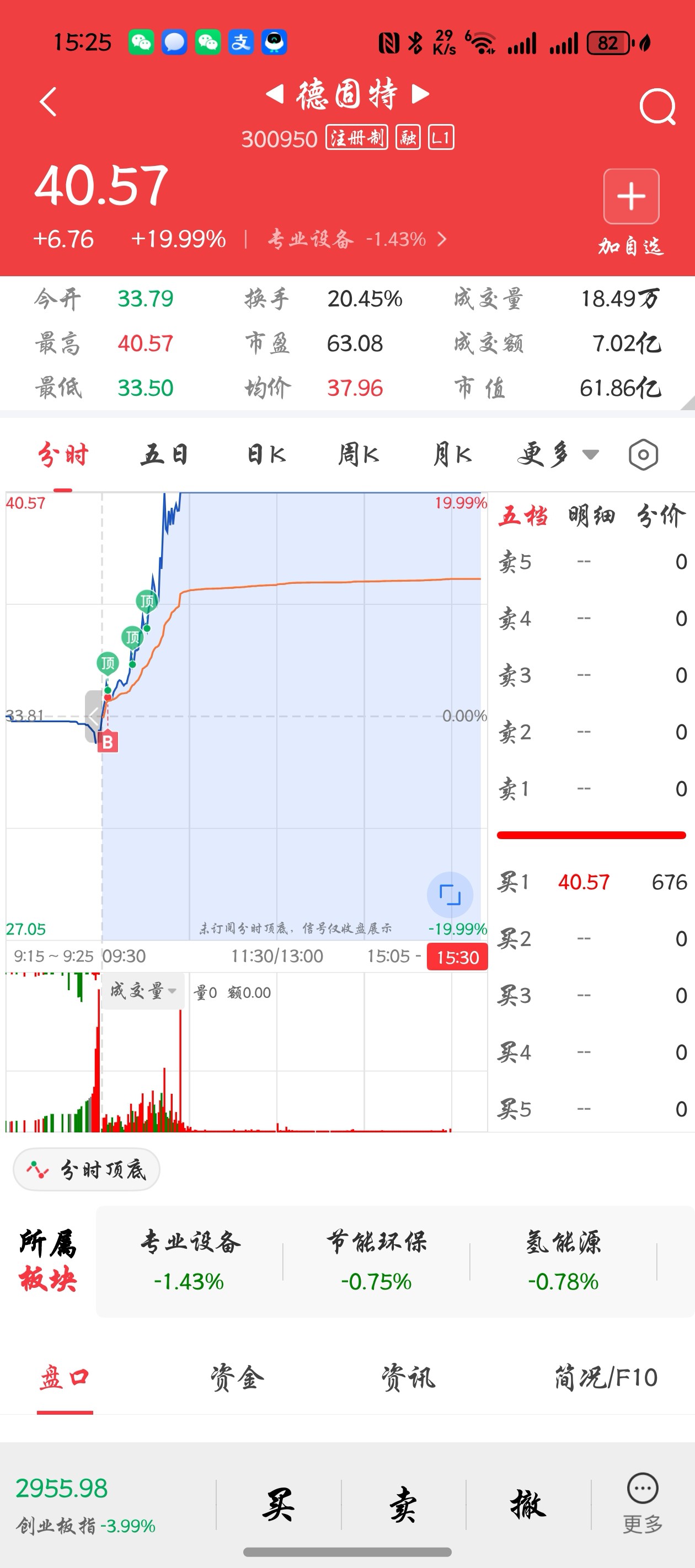 $德固特(SZ300950)$ 今天闹乌龙了,开盘本来想买固德威的,自选里两个票买错了,开盘买德固特追进去。因为早上忙也没看盘,中午涨停后发给朋友炫耀,这才知道买错了,买对的话还要吃面呢,真是踩了运。