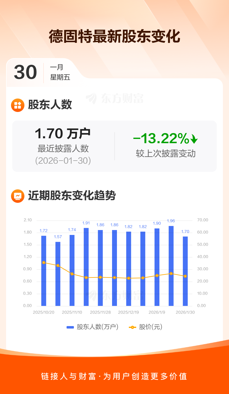德固特:截至1月30日最新股东户数1.70万户,较上期减少13.22%