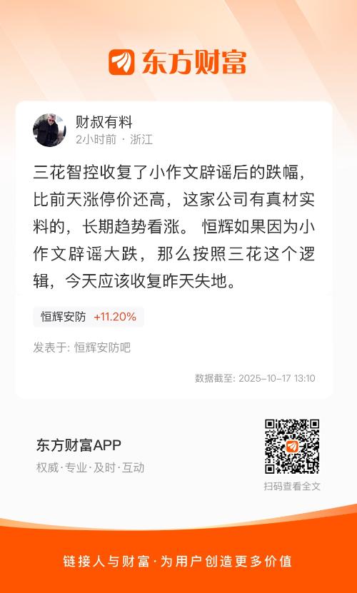 三花智控收复了小作文辟谣后的跌幅,比前天涨停价还高,这家公司有真材实料的,长期趋势看涨。 恒辉如果因为小作文辟谣大跌,那么按照三花这个逻辑,今天应该收复昨天失地。