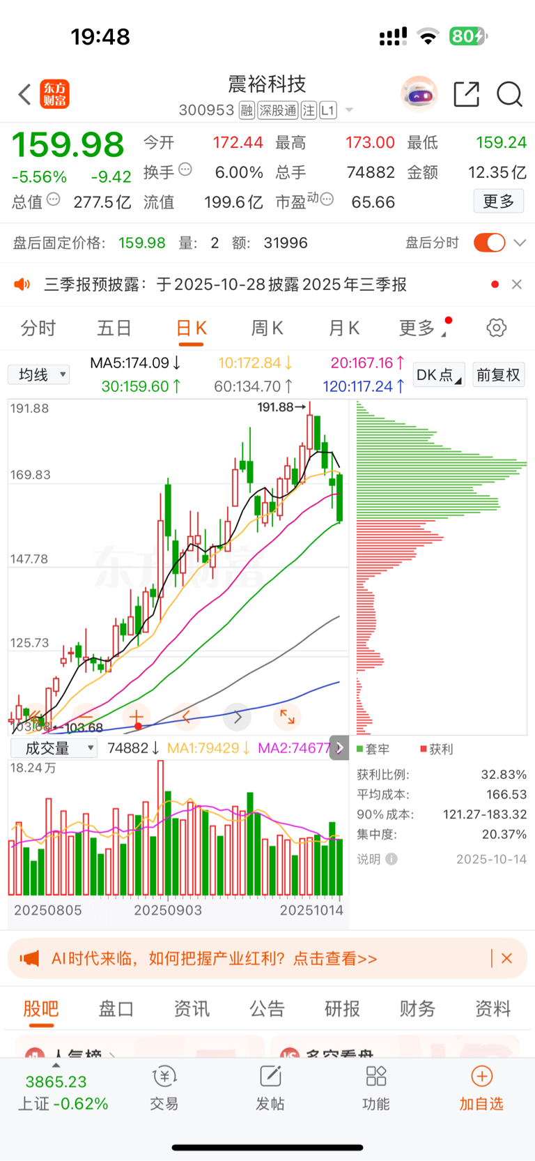 $震裕科技(SZ300953)$ 主力要走,最简单直接一点量肯定放大出来,但量一直处于堆量的状态,再加上市场情绪的不稳,恐慌情绪太强烈,他又处于历史新高,这个位置对于散户来说就是顶点了!但这个顶是顶吗?很简单一点人家业绩摆在哪里,业绩决定估值估值决定价格!200肯定过的!还有其他原因就不细说!#收盘点评# #炒股日记# #复盘记录# #强势机会#
