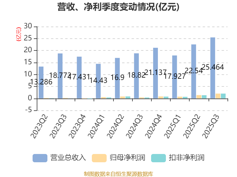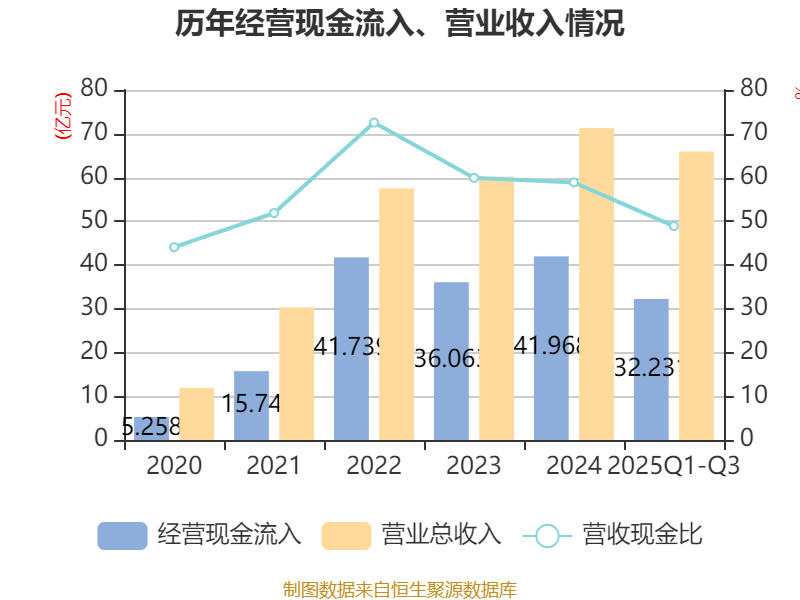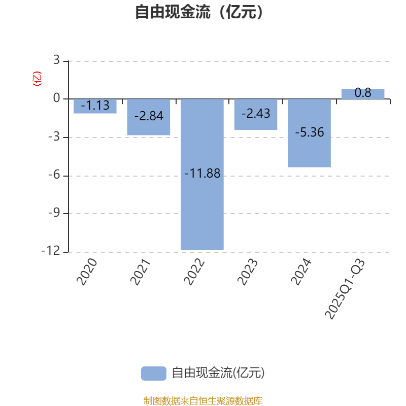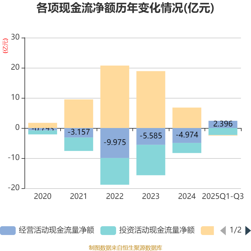 2025年前三季度,公司经营活动现金流净额为2.4亿元,同比增加6.58亿元;筹资活动现金流净额-1887.22万元,同比减少5.06亿元;投资活动现金流净额-2.34亿元,上年同期为-3.59亿元。