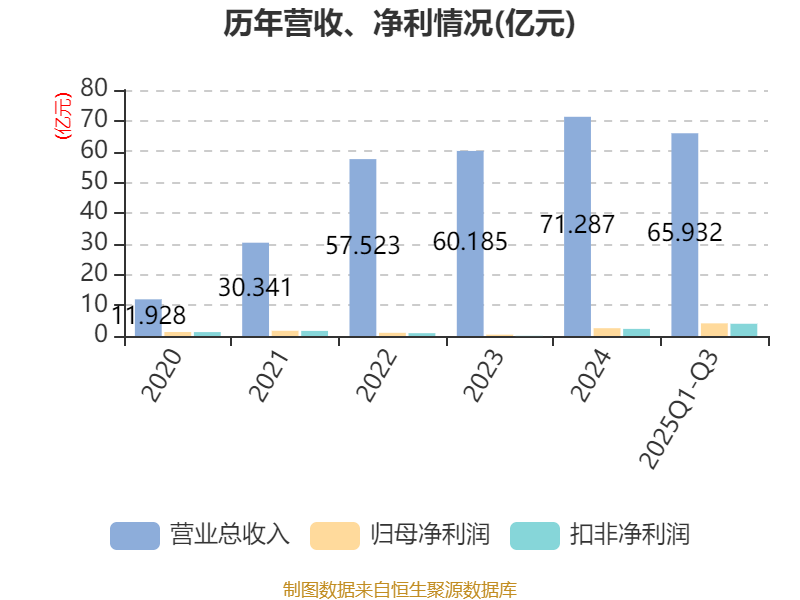 中证智能财讯震裕科技(300953)10月28日披露2025年第三季度报告。前三季度公司实现营业总收入65.93亿元,同比增长31.47%;归母净利润4.12亿元,同比增长138.93%;扣非净利润3.98亿元,同比增长153.42%;经营活动产生的现金流量净额为2.4亿元,上年同期为-4.19亿元;报告期内,震裕科技基本每股收益为2.43元,加权平均净资产收益率为11.38%。
