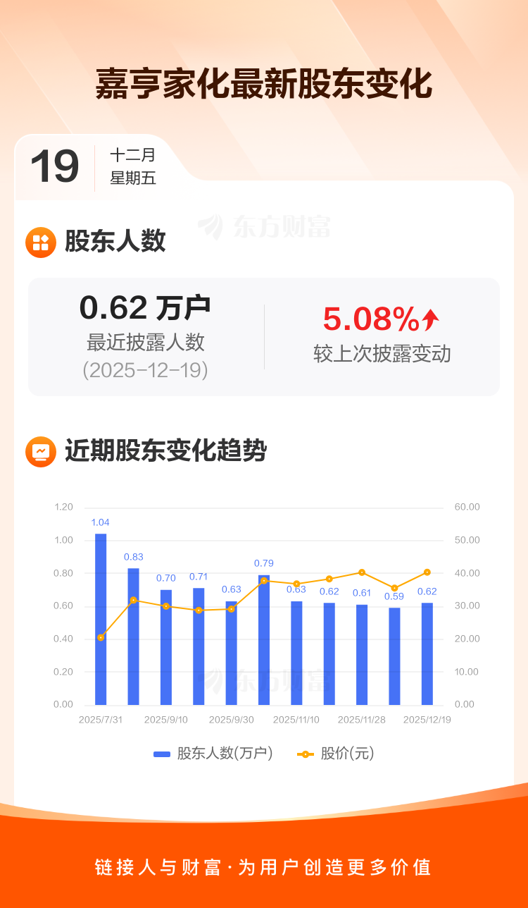 嘉亨家化最新披露数据显示,截至12月19日公司股东户数为6200户,较上期(2025年12月10日)增加300户,增幅为5.08%。户均持有流通股数量由上期的1.71万股下降至1.63万股,户均持股金额由上期的60.69万元增加至65.59万元。