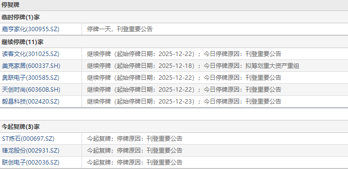 上证报中国证券网讯 12月25日,1家公司临停:嘉亨家化,3家公司复牌:ST炼石、锋龙股份、联创电子。