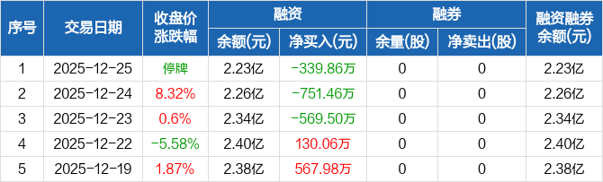 融资方面,当日融资买入0元,融资偿还339.86万元,融资净偿还339.86万元,连续3日净偿还累计1660.82万元。融券方面,融券卖出0股,融券偿还0股,融券余量0股,融券余额0元。融资融券余额合计2.23亿元。