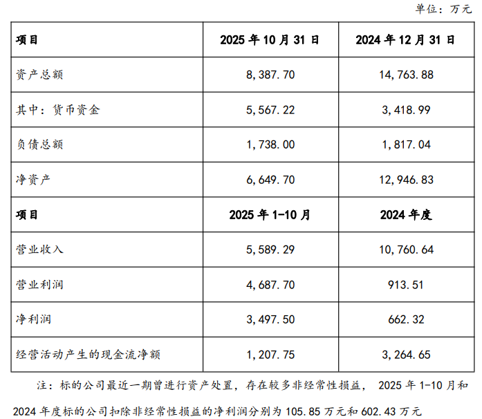 标的公司财务数据方面,公告显示,截至2025年10月末,标的公司资产总额8,388万元,资产总额1738万元,资产负债率约21%,净资产6,650万元,货币资金5,567万元,账面现金流相对充裕。2024年及2025年1-10月,佛山智强分别实现营业收入1.076亿元、0.5589亿元;净利润662万元、3,498万元,但标的公司最近一年曾进行资产处置,存在较多非经常性收益,2024年及2025年1-10月,公司扣非后净利仅602万元、106万元。
