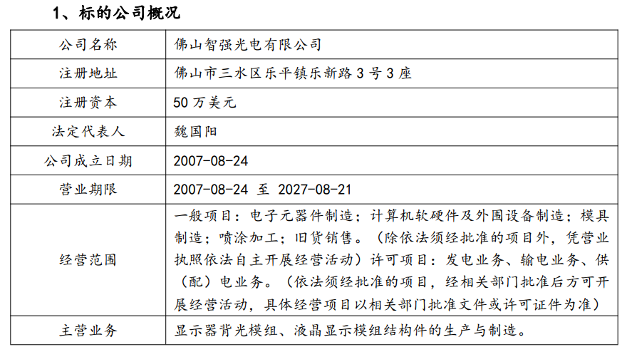 公告显示,智强光电成立于2007年8月24日,注册资本50万美元。佛山智强主营业务为显示器背光模组、液晶显示模组结构件的生产与制造。标的公司自2008年成为北美某品牌商供应商。目前主要为北美某品牌商提供背光模组中的背板及弹片零部件,同时具有液晶显示模组中的防护罩及背板挂件订单。多年来,标的公司在某系列产品的每一次迭代更新中均持续供应关键的背板部件,与北美某品牌商保持稳定的合作关系。