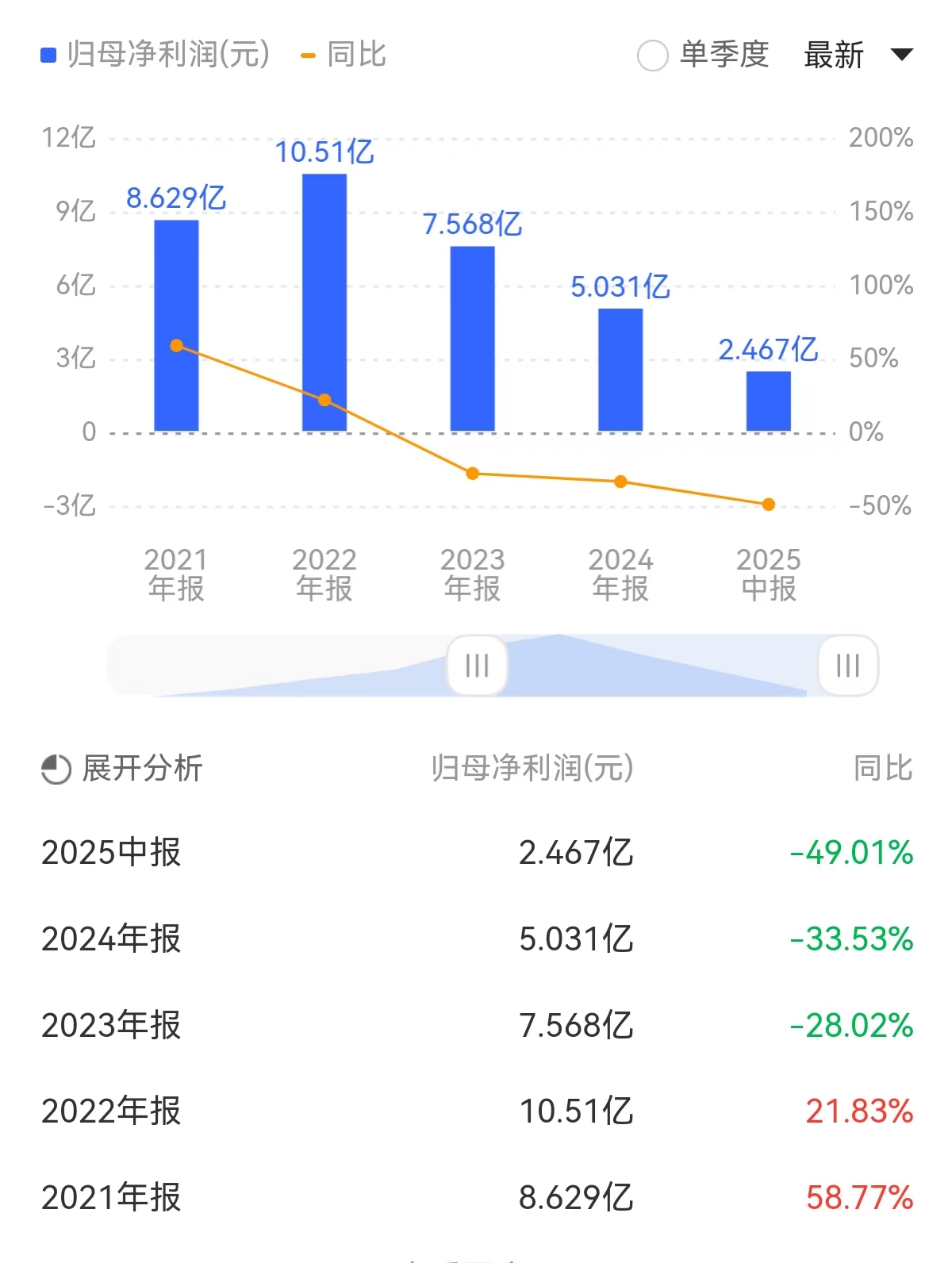 2025年上半年,贝泰妮延续业绩颓势:实现营业收入23.72亿元,同比下滑15.43%;归母净利润2.47亿元,同比下滑49.01%;扣非归母净利润1.83亿元,同比下滑56.48%。
