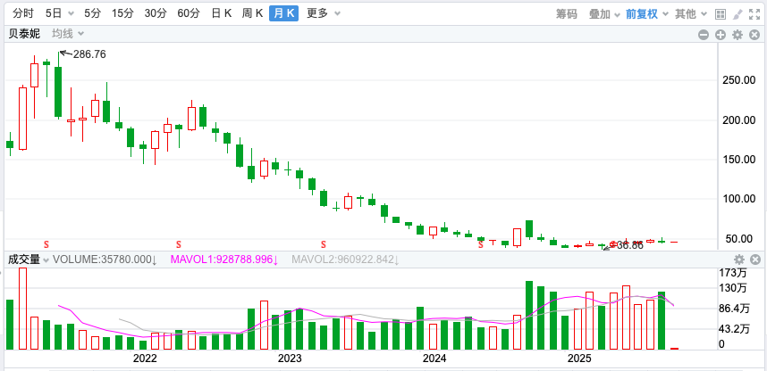 二级市场上,2021年贝泰妮顶着“药妆第一股”的光环登陆创业板,上市初期股价一度飙升至286.76元/股,总市值一度高达1215亿元。然而,截至2025年10月9日收盘,贝泰妮股价仅45.81元/股,低于其发行价47.33元/股,距离其股价高点累计下跌84%。最新总市值仅剩194亿元,更是不及巅峰时的零头,市值缩水超1000亿元。