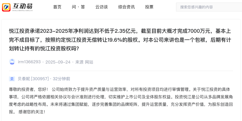 对此,贝泰妮董秘回复称,公司始终致力于提升资产质量与运营效率,对所有投资项目均进行审慎管理。关于悦江投资的具体事项,公司将严格依据相关协议与会计准则进行处理,切实维护上市公司及全体股东权益。投资悦江是公司从多品牌发展角度考虑的战略性布局。未来将通过集团赋能,逐步完善集团的品牌矩阵,提升运营质量,充分发挥资产价值,为股东创造回报。