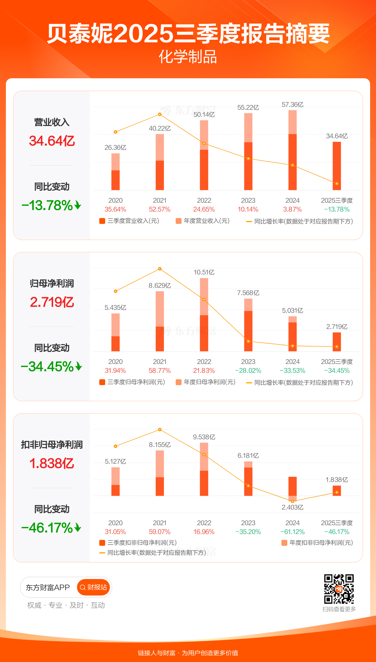 贝泰妮10月28日发布2025年三季报显示,公司前三季实现营业收入34.64亿元,同比下滑13.78%;归母净利润2.72亿元,同比下滑34.45%;扣非归母净利润1.84亿元,同比下滑46.17%