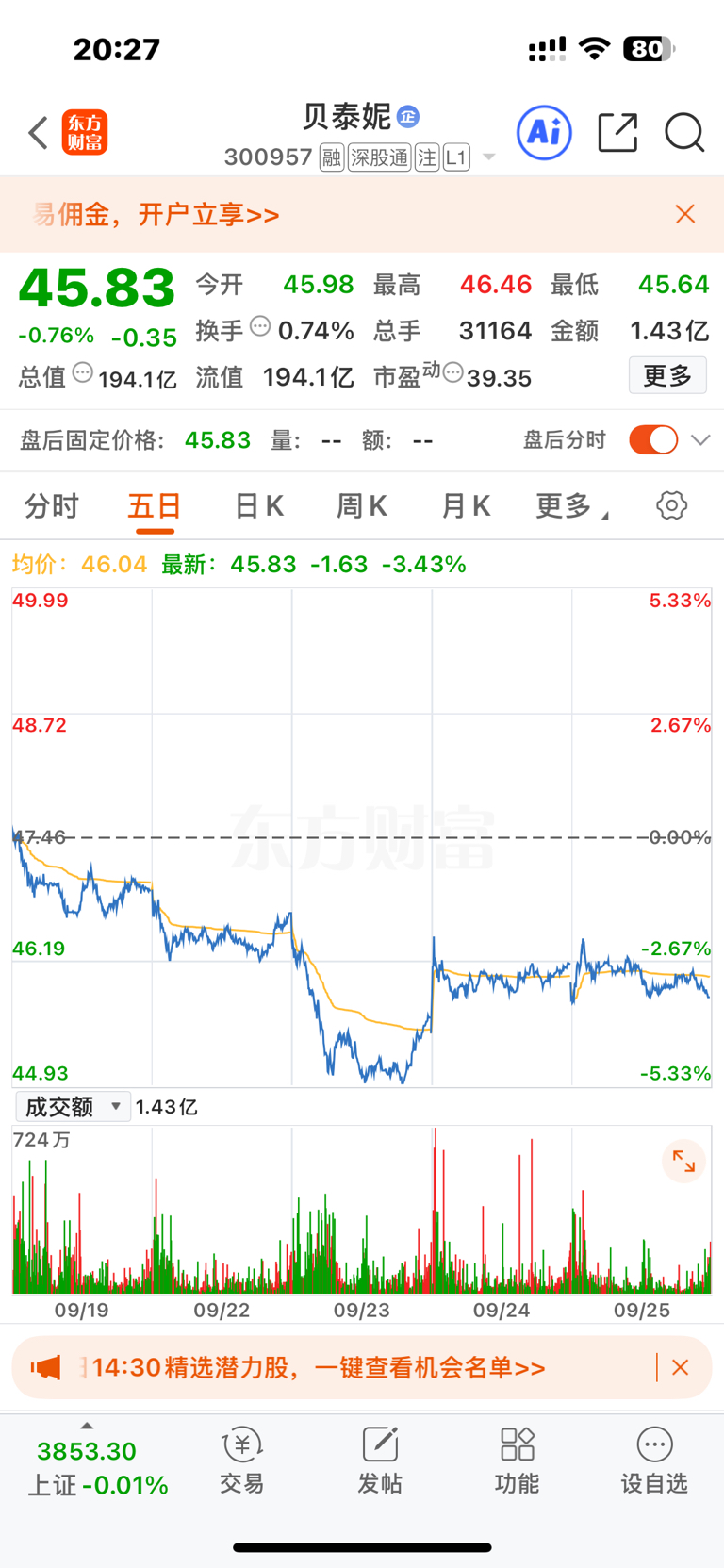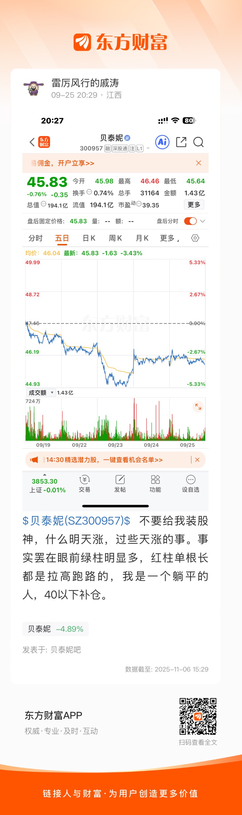 $贝泰妮(SZ300957)$ 不要给我装股神,什么明天涨,过些天涨的事。事实罢在眼前绿柱明显多,红柱单根长都是拉高跑路的,我是一个躺平的人,40以下补仓。