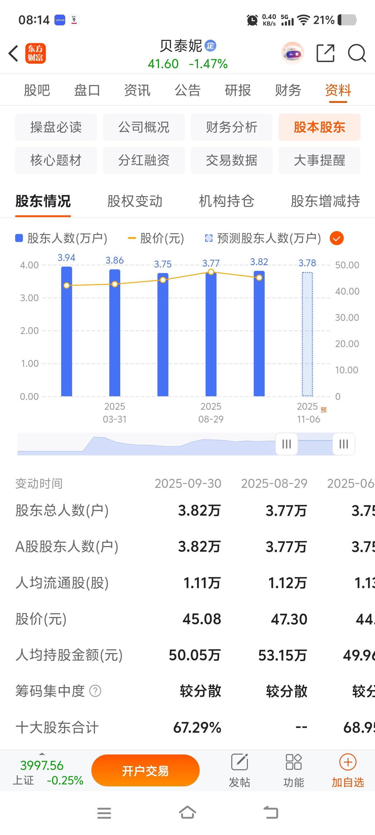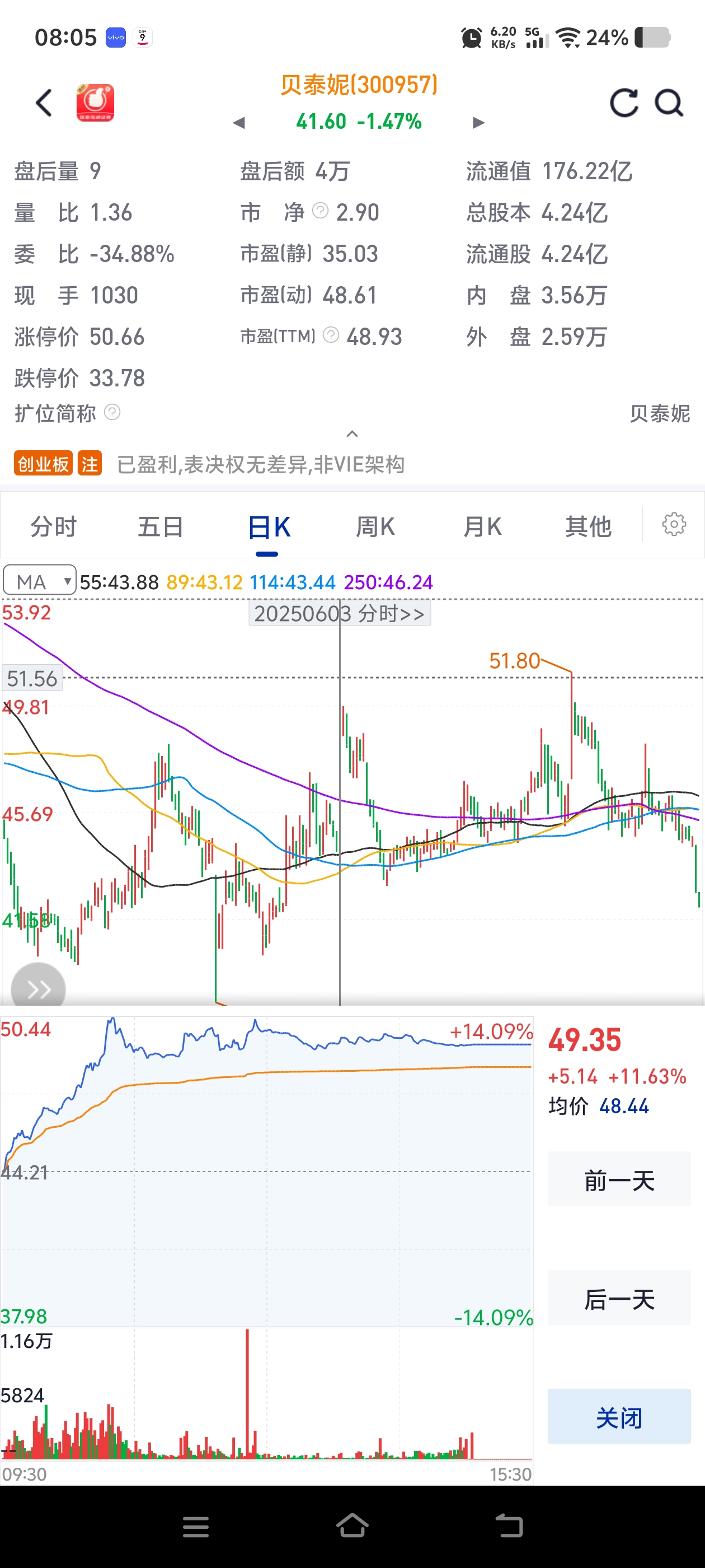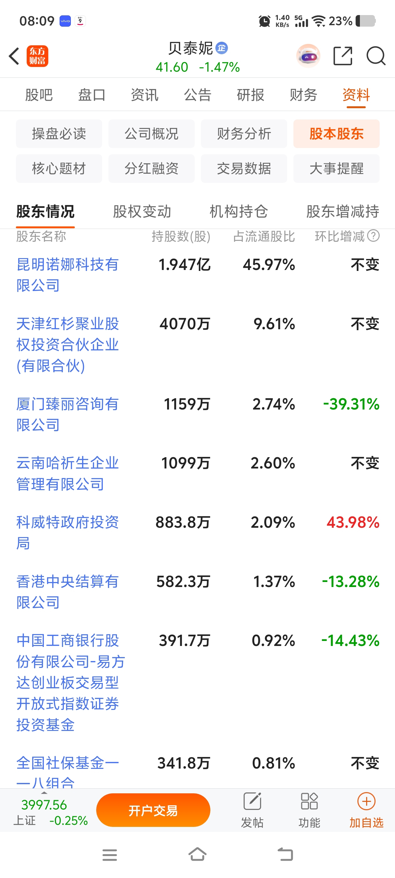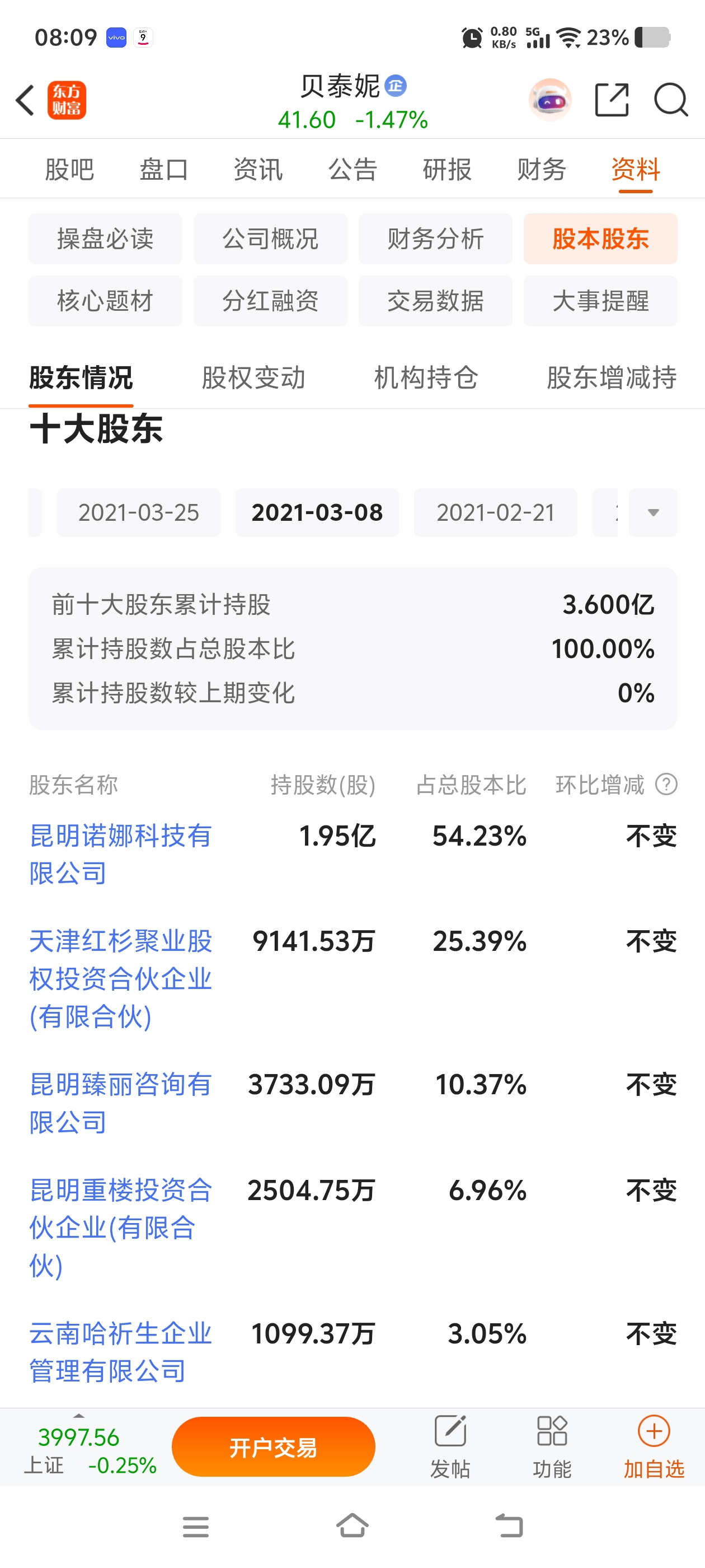 股市有句横有多长竖有多高,贝泰妮和十年前的荣盛石化有点相似。另外,贝泰妮本身参与资本运作类的基金,这股本身也有资本运作的明显动作,看看下面两天对应日期里的其它几个同行业股走势,另外,从上市前的五个大小非合计持股3.6亿股,到目前合计持有也就2.5亿多股了,红杉持股目前剩下三千二百多万股了,巴菲特看好的美妆行业牛气正在聚集中,看看新易盛和中际旭创之类的股本和总市值,A股疯狂起来根本摁不住