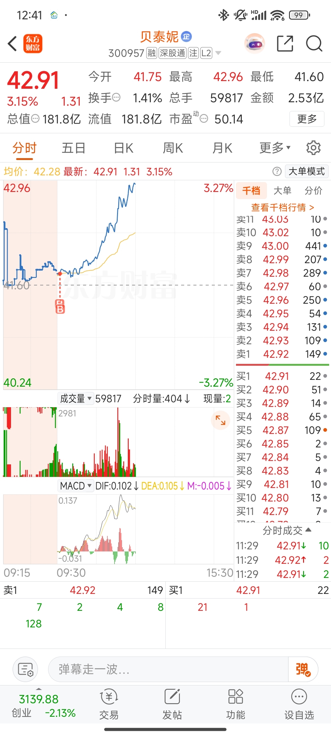 $贝泰妮(SZ300957)$ 千手哥周末复盘两天发现贝泰妮已具备博弈价值,周一正式从锂矿调仓换股来到消费
