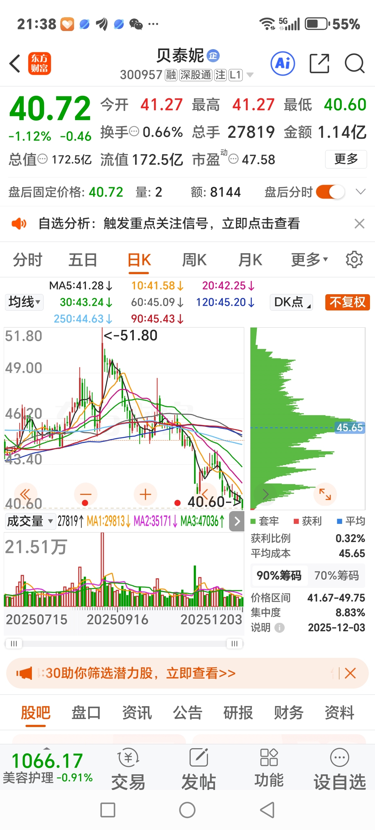 $贝泰妮(SZ300957)$ 这么密集的筹码峰,假如你是主力你敢进去给散户抬轿子?