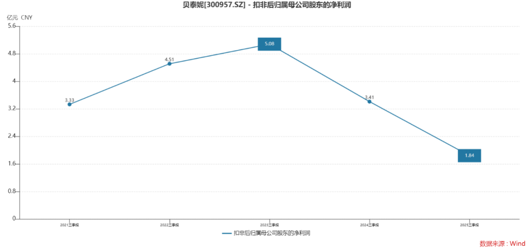 2025年1-9月,贝泰妮扣非后净利润为1.84亿元,同比大幅下降46.17%,接近“腰斩”。
