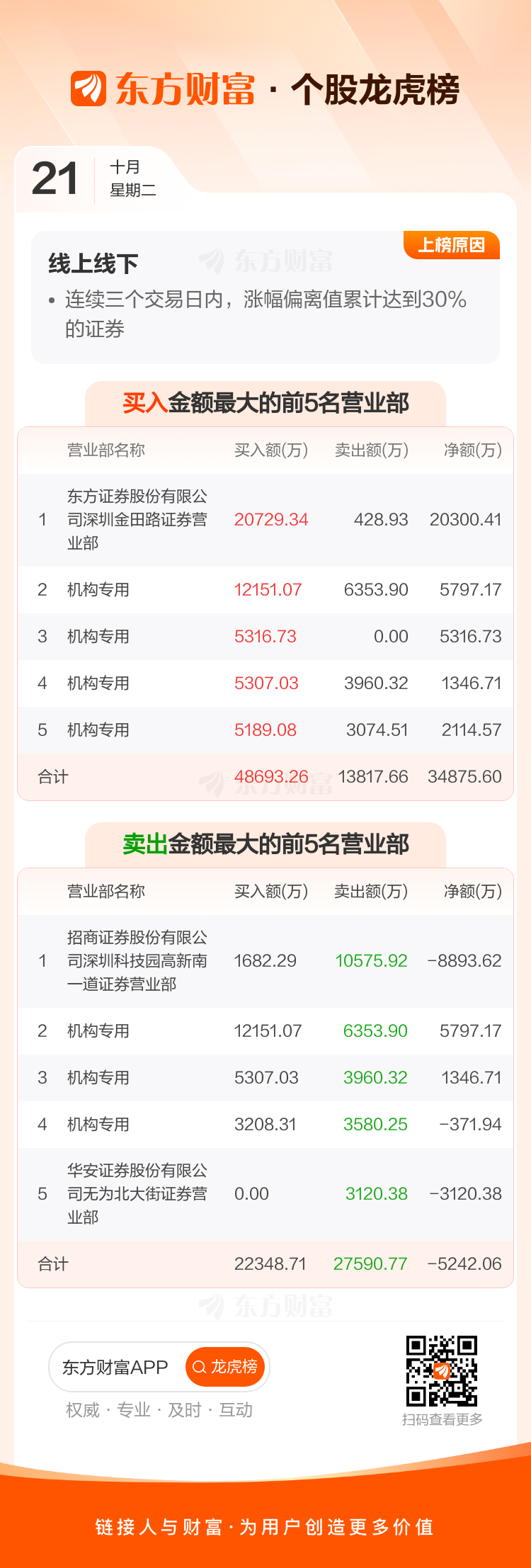 交易所2025年10月21日公布的交易公开信息显示,线上线下因成为连续三个交易日内,涨幅偏离值累计达到30%的证券上榜。线上线下当日收报106.08元,涨跌幅14.72%,换手率27.70%,成交额14.31亿。异常期间10月17日至10月21日,期间涨幅38.00%,累计偏离值37.22%,区间成交额33.79亿。