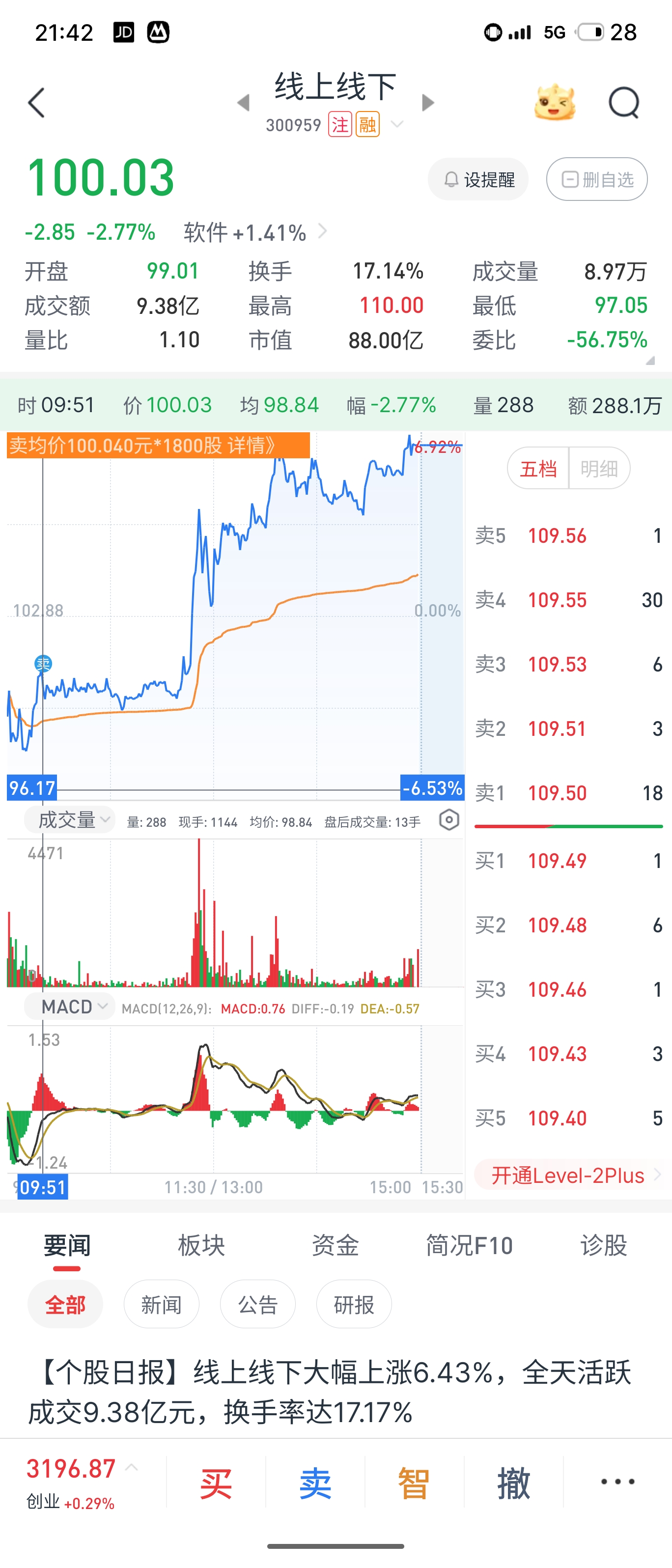$线上线下(SZ300959)$ 上周四109.59买2000股,上周五吃大面。今天早上100.04卖1800股。