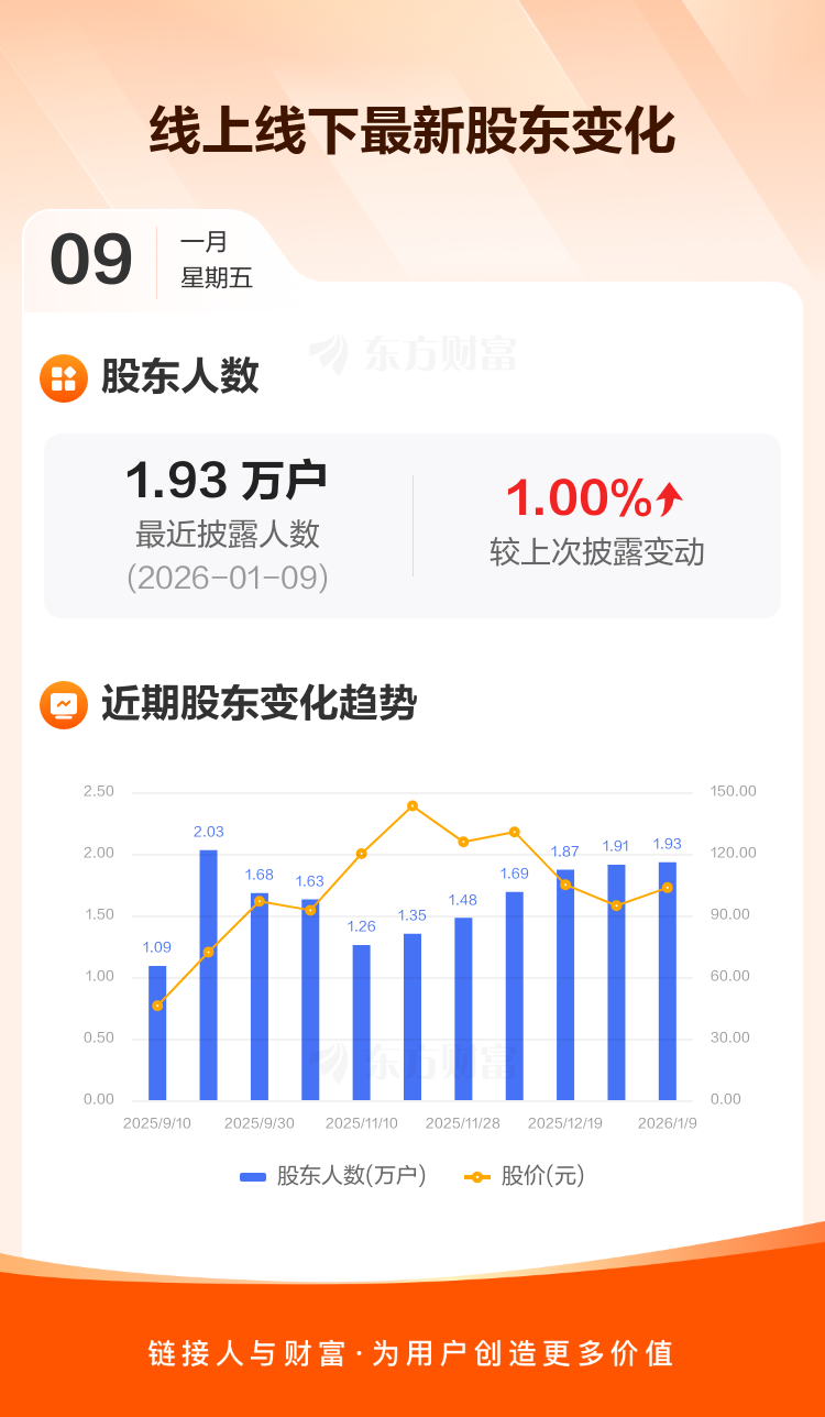 线上线下最新披露数据显示,截至1月9日公司股东户数为1.93万户,较上期(2025年12月31日)增加192户,增幅为1.00%。户均持有流通股数量由上期的2739股下降至2712股,户均持股金额由上期的25.94万元增加至28.06万元。