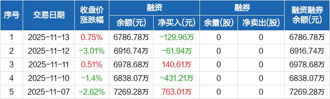 通业科技:融资净偿还129.96万元,融资余额6786.78万元(11-13)