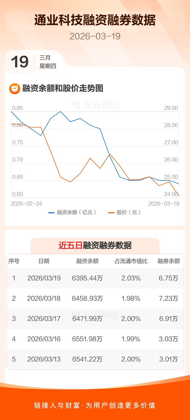 交易所最新数据显示,通业科技于2026年3月19日获融资买入270.35万元,融资偿还333.84万元,当日融资净偿还63.49万元。目前,该股融资余额6395.44万,占流通市值比例为2.03%。
