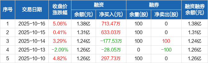 融资方面,当日融资买入3019.44万元,融资偿还2305.97万元,融资净买入713.47万元。融券方面,融券卖出0股,融券偿还0股,融券余量100股,融券余额1786元。融资融券余额合计1.38亿元。