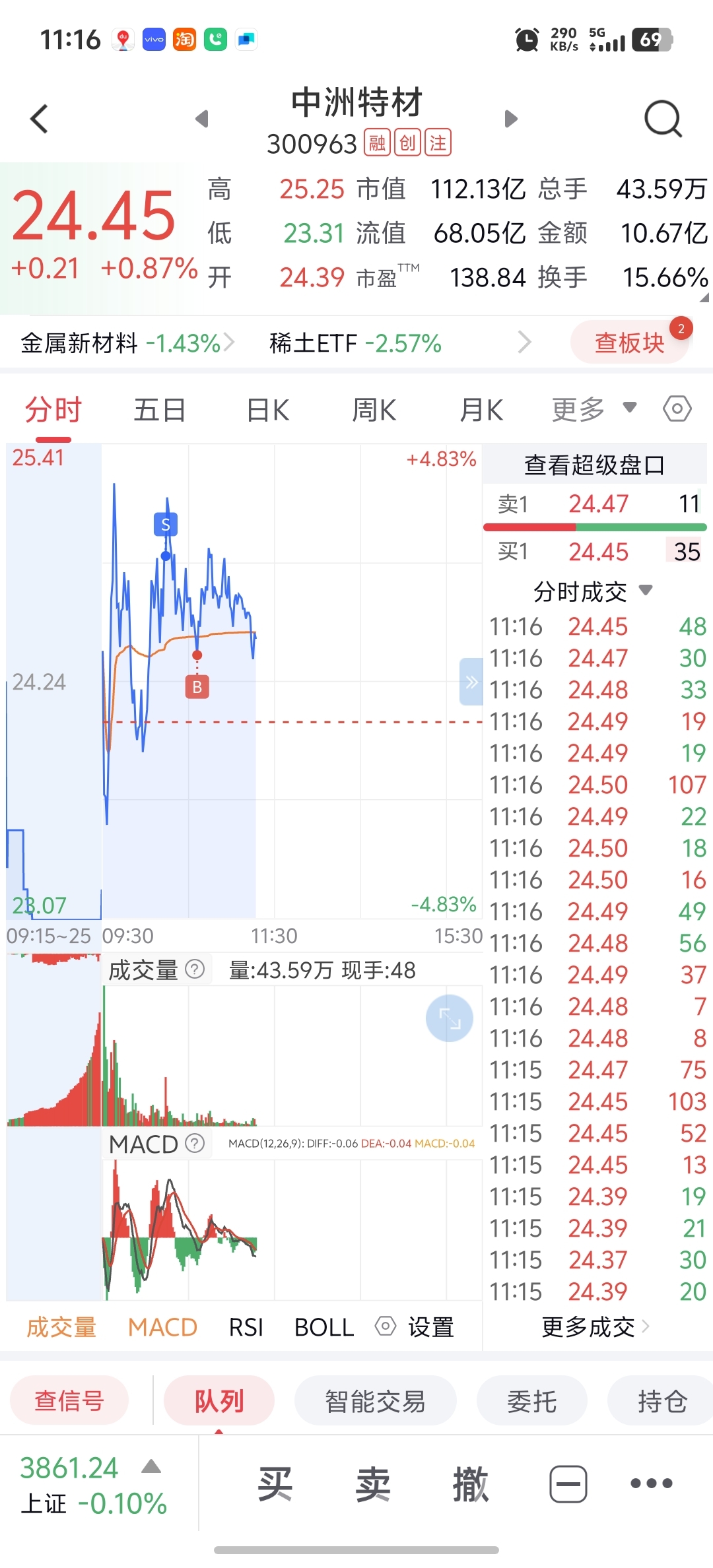 $中洲特材(SZ300963)$ 昨天进的卖了,入了一点点的看盘