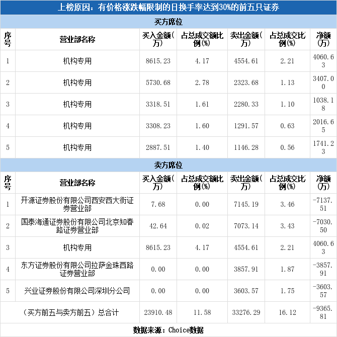 龙虎榜数据显示,今日共6个机构席位出现在龙虎榜单上,分别位列买一、买二、买三、买四、买五、卖三,合计净买入1.23亿元,占该股今日总成交额的5.94%。除此之外还有正邦科技、雷科防务、中国铀业等38只个股榜单上出现了机构的身影,其中19家呈现机构净买入,获净买入最多的是正邦科技,净买额为9.04亿元;19家呈现机构净卖出,其中遭净卖出最高的为中国铀业,净卖额为1.15亿元。