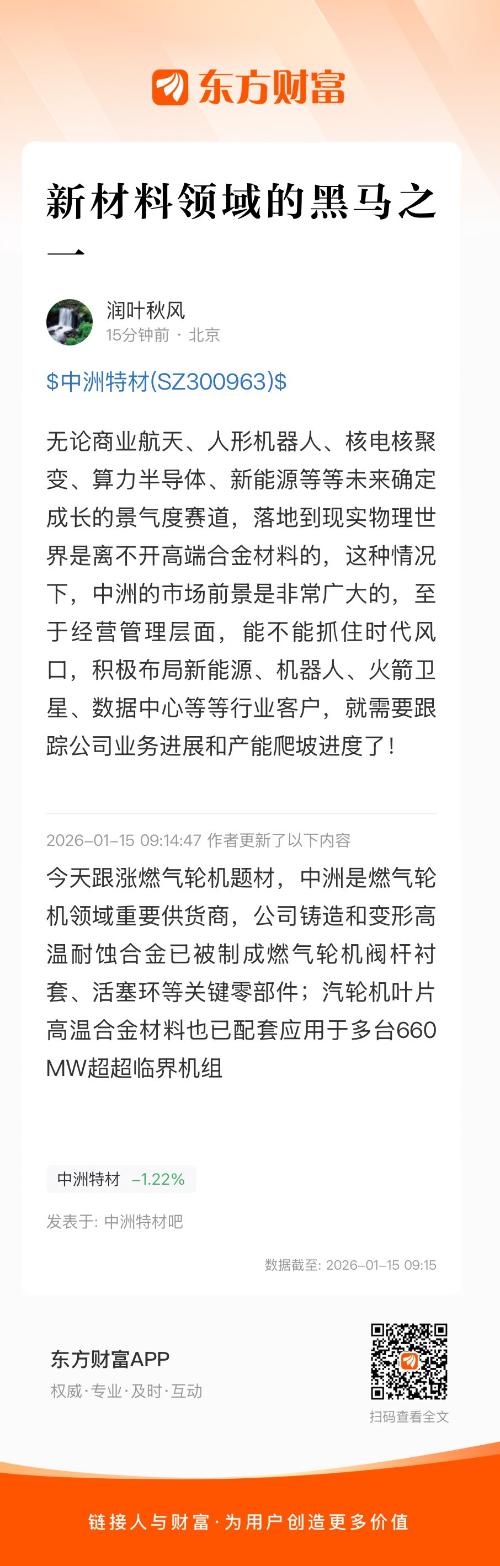 无论商业航天、人形机器人、核电核聚变、算力半导体、新能源等等未来确定成长的景气度赛道,落地到现实物理世界是离不开高端合金材料的,这种情况下,中洲的市场前景是非常广大的,至于经营管理层面,能不能抓住时代风口,积极布局新能源、机器人、火箭卫星、数据中心等等行业客户,就需要跟踪公司业务进展和产能爬坡进度了!