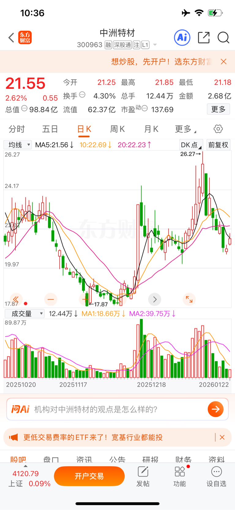 $中洲特材(SZ300963)$ 量起来了,1个小时成交量是昨天一天的量,说明一致看好,26下来已经跌25%了,今天开启反弹,收盘站上15日线22.20。