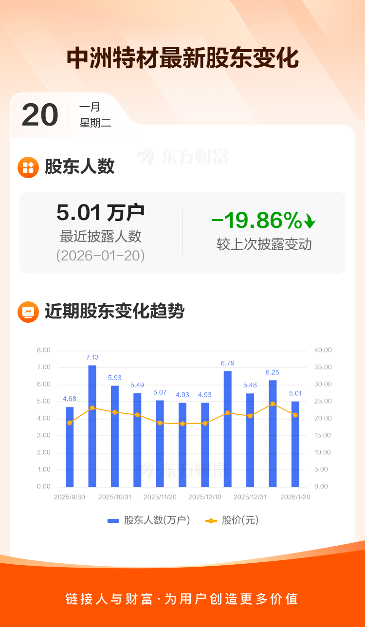 中洲特材最新披露数据显示,截至1月20日公司股东户数为5.01万户,较上期(2026年1月9日)减少1.24万户,降幅为19.86%。户均持有流通股数量由上期的4629股上升至5777股,户均持股金额由上期的11.27万元增加至12.16万元。